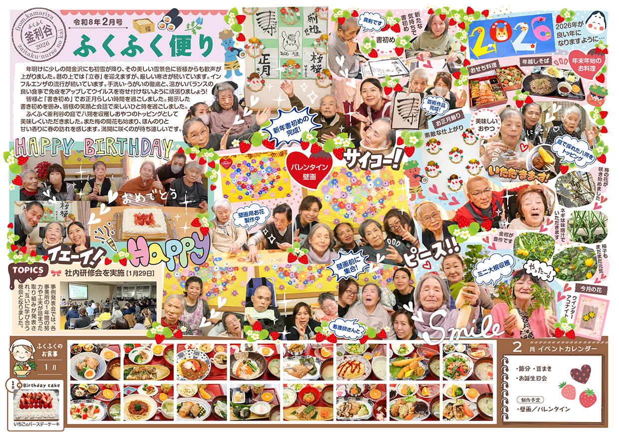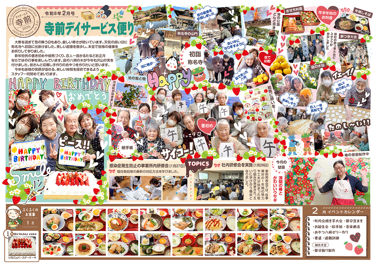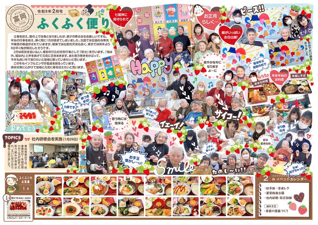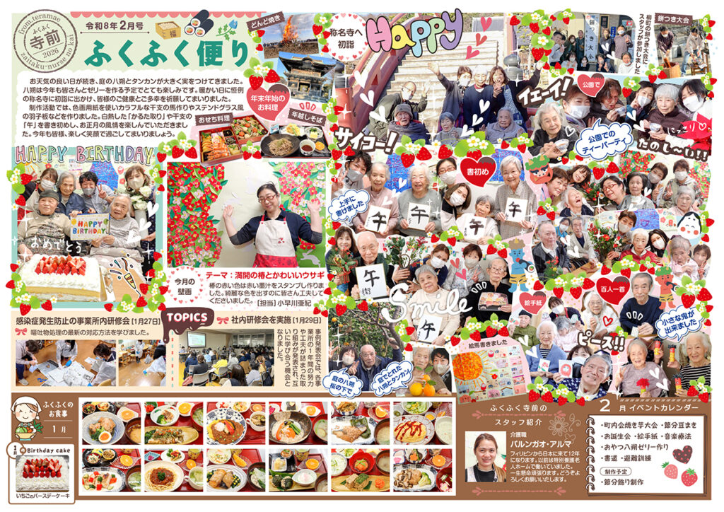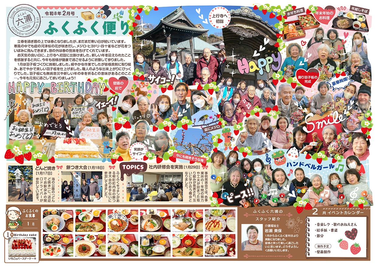さて02月号のふくふく便りは、お正月らしい話題(書初め・飾り羽子板作り・七福神や目出鯛壁画の作成など)でいっぱい。その他には、初詣の様子(寺前と寺前デイは称名寺、六浦は上行寺)、餅つき大会やどんど焼きの写真もあります。