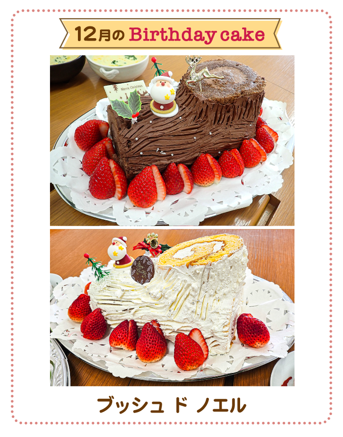 12月のバースデーケーキは、毎年恒例クリスマスならではの木を模したケーキ「ブッシュ ド ノエル」。チョコとクリームの2種類を作りました。